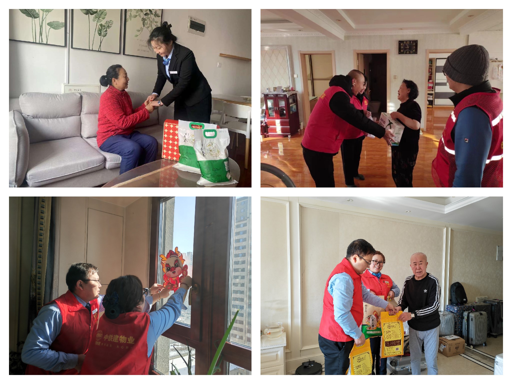 新年的一抹抹色彩,高地物业的能工巧匠为业主用心点缀。中国结、红灯笼、彩灯将浓浓的春节氛围拉满,手写对联、准备福字,为业主送出最美好的祝福。同时,高地物业关注到了园区内一些面临孤独、无助困境的老年群体。长春片区总经理代晓会带领支部党员、志愿者,通过新年慰问、入户帮扶的形式,为园区10户年龄在60+岁的孤寡贫困群体送去关怀与陪伴。高地物业志愿者们都会致以真诚问候,与老人们聊聊家常、沟通近况,同时送上米、面等慰问物资以表节日的祝福与关怀。
